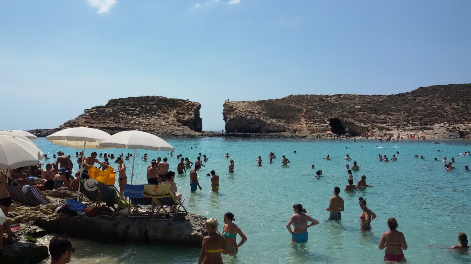 After that we had dinner at the beach and went back home. What a nice start for the weekend. The next day we wanted to go to the blue lagoon “to get a tan” and I can already tell you that: we achieved our goal…. Getting there took us quite some time (going to Mosta -> supermarket – waiting for the bus -> going to Cirkewwa -> going by ferry) When we finally arrived at Comino we by far where not the only people there. It was the most crowded by tourist place I saw so far in Malta. Nevertheless we made the best of it. We found a little rock which was not that easy to reach and we put all our stuff on it and hoped that no one will want to steal our bags. Then we swam to the other side where you could see a big cave where you can swim through – and this is what Lisette and I did. And I will never regret it – it was a bit exciting and stunningly beautiful. Some guys climbed up the inner walls of the cave and jumped down into the water and when I went on swimming you came out of the cave again and had an awesome view of the sea and surrounding land. A view you cannot catch with your camera.