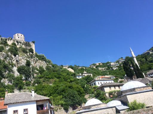 Die noch folgenden zwei Stunden machten mich noch euphorischer, immer häufiger sah man Moscheen in den kleinen Dörfchen, an denen wir vorbeifuhren und die Landschaft ließ mich nicht los. In Mostar würde ich nicht so viel Zeit haben, daher entschied ich mich am Busbahnhof ein Taxi zu nehmen, um nicht zu viel Zeit mit der Wegsuche zu verschwenden. Ich fragte, wie viel die Fahrt zum Hostel kosten würde und der Fahrer sagte 5 Euro. Na gut, geht ja dachte ich mir, sicher ein etwas überhöhter Preis, aber immer noch ok. Die Fahrt dauerte dann ca. 7 Minuten und mir schwante, dass ich ihm sicherlich eher das vierfache des gewöhnlichen Preises zugesichert hatte, was der Typ im Hostel mir daraufhin bestätigte. Als ich vor dem Hostel herausgelassen wurde, überkam mich kurz ein ungutes Gefühl, da hing nur ein kleines Schild an einer Tür, die wenn man sie öffnete einen zerfallenen Garageneingang eröffnete. Hinter dem dort parkenden Auto befand sich noch eine Tür, die ich zaghaft öffnete. Im Hostel wurde ich dann von einem sehr netten Holländer begrüßt, der mir sympathischerweise erstmal Tipps für die Stadt gab, bevor er meinen Pass kopierte und die organisatorischen Dinge erledigte. Das Hostel war total niedlich, ich fühlte mich von der ersten Sekunde an wohl, dennoch bin ich natürlich sofort losgezogen um endlich diese Stadt zu erkunden.