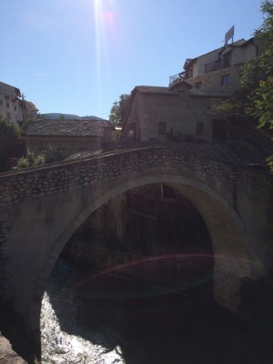 Am nächsten Morgen hatte ich noch 2 Stündchen Zeit, bevor mein Bus nach Mostar fuhr, daher zog ich nochmal durch die Innenstadt, immer vor der Sonne flüchtend, da der Sonnenbrand noch nicht weniger geworden war. Ich ließ nochmal die alten Mauern auf mich wirken und trank einen überteuerten Espresso (2,60 Euro!!) mitten im Diokletianspalast. Um 10:50 und nach fünfmaligem Fragen, ob der Bus wirklich nach Mostar führe, stieg ich in den Bus und setzte mich klugerweise auf die rechte Seite, was mir in den folgenden 3 Stunden den perfekten Blick auf die kroatische Küste ermöglichte. In solchen Momenten bin ich immer total glückselig und kann es kaum fassen, wie schön die Welt ist und was für ein Luxus es ist, dass ich diese Naturschönheiten sehen und erleben darf. Im Hintergrund lief ein kroatischer Radiosender, der abwechselnd Hits der 90er und kroatische Songs spielte. Alles passte perfekt. Es wurde noch schöner, als wir die Küste ins Landesinnere verließen. Nach einer sehr harmlosen Passkontrolle fuhren wir durch ein Bergpanorama, das mein Herz noch höher schlagen ließ. Als wir an einer Bushaltestelle längere Zeit warteten, dachte ich mir erst nichts weiter dabei und auch als der Busfahrer irgendetwas in den Bus rief nicht. Doch hörte ich gehäuft das Wort Mostar, sodass ich, gerade als der Bus sich wieder in Bewegung setzte doch mal bei dem Pärchen vor mir nachfragte, was denn los sei. Sie erklärten mir in einem Sprachwirrwar, dass man wenn man nach Mostar will in den anderen Bus hätte umstiegen müsse. Ich packte mein Zeug und rannte nach vorne zum Fahrer. Er hielt an, ließ mich raus und ich sprintete zum anderen Bus. Na das ist ja nochmal gut gegangen.