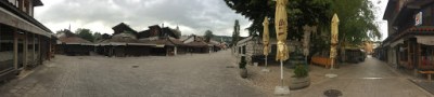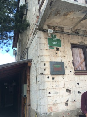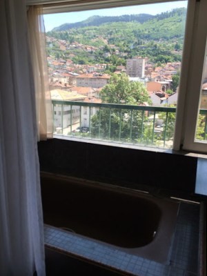 Mein Zimmer hatte auch einen wahnsinnig tollen Blick und – und das war auch der Grund warum ich dieses Apartment ausgewählt hatte, eine Badewanne, die direkt am Fensterbereich eingelassen war, sodass man dieses wunderschönen Blick bei einem heißen Bad genießen konnte. Wieder einmal ließ ich mir natürlich nicht zuviel Zeit, da ich so viel wie möglich entdecken wollte in der kurzen Zeit, die mir blieb. Zuerst ging es zum alten Basar, Baščaršija genannt, welcher neben unzähligen kleinen Marktständen, die mittlerweile ausschließlich Souvenirläden und Restaurants beherbergten sowie wenige Bäckereien und Lebensmittelgeschäfte. Trotzdem alles sehr touristisch wirkte, wurde meine Frage nach einer gebuchten Tour zu dem Tunnel, welcher Sarajevo zur Zeit der Belagerung mit Lebensmitteln versorgt hatte, erschwert, da sich noch niemand für diese Tour angemeldet hatte und mindestens zwei Personen teilnehmen müssen, damit sie stattfindet. Also lief ich erstmal durch die Stadt und schaute mir noch einmal alles in Ruhe an, später wanderte ich zum Olympiagelände von 1984, zumindest dachte ich, es sei das Gelände, wo auch die Bobbahn wäre, von der mir bereits in Mostar erzählt wurde. Dem war nicht so, es waren eher die Trainingshallen und als ich mich am Wachmann vorbeischlich(er ignorierte mich einfach), war das Gelände doch eher unspektakulär, dennoch begann er mir nun zu folgen und ich bewegte mich dann doch recht schnell wieder aus dem Gebäude heraus.